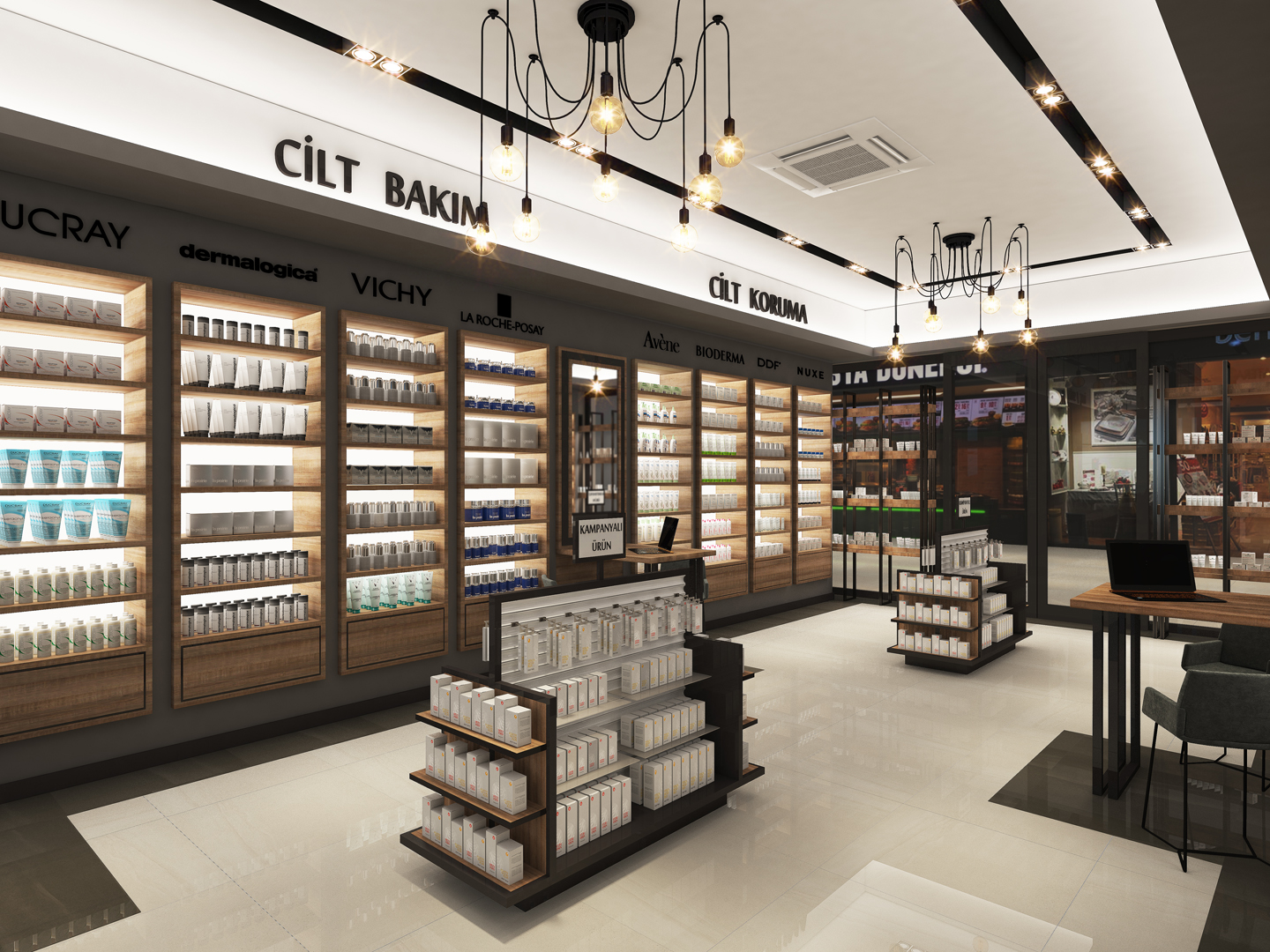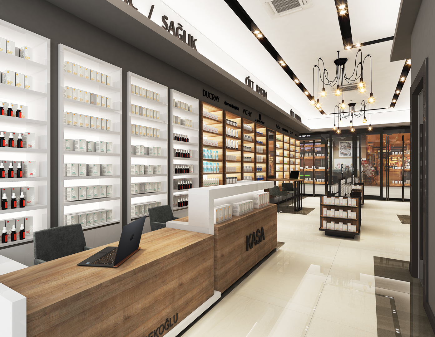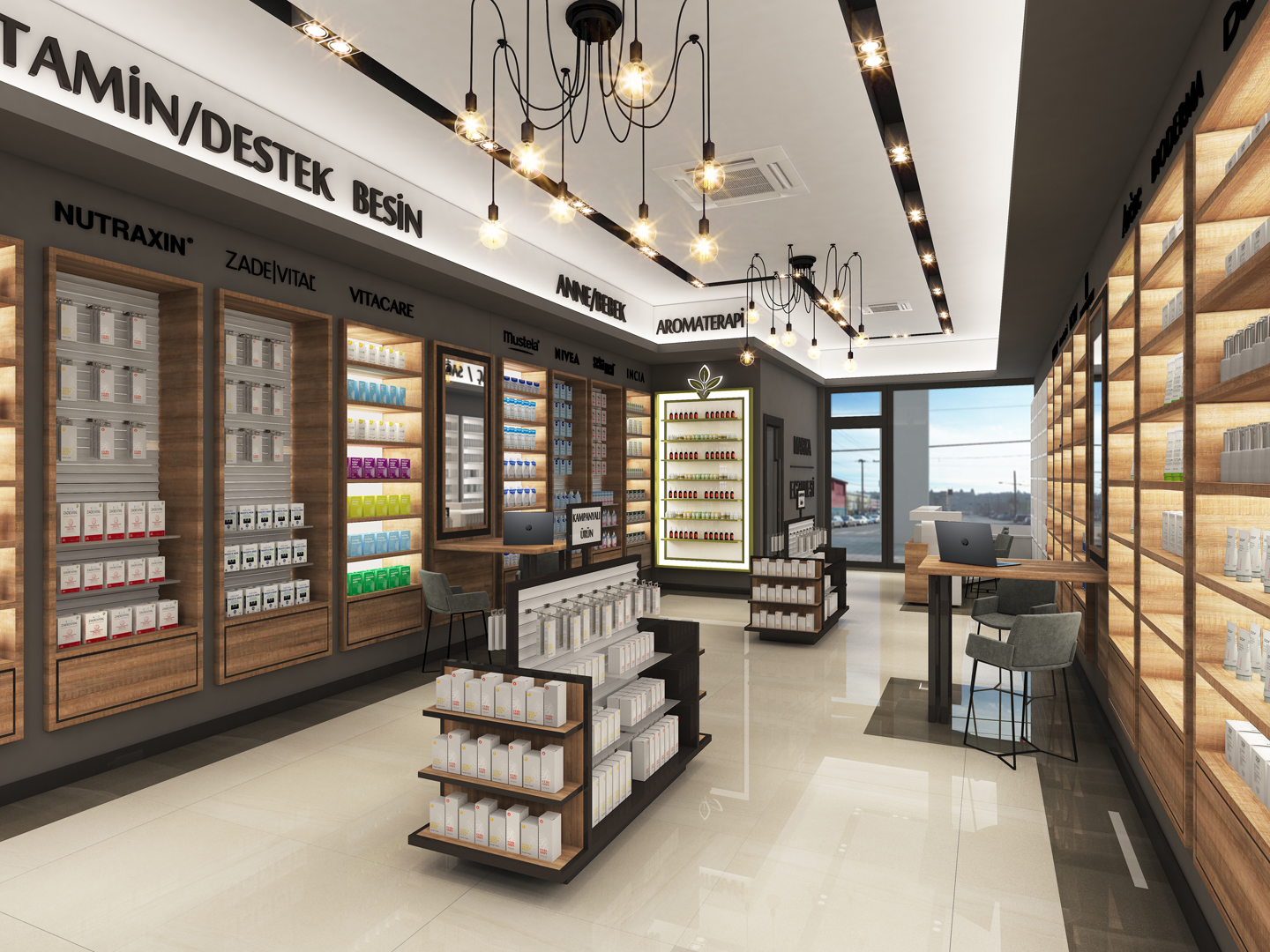 - Eczane ürünlerinin sergilenmesine uygun ergonomik raf ve teşhir sistemleri