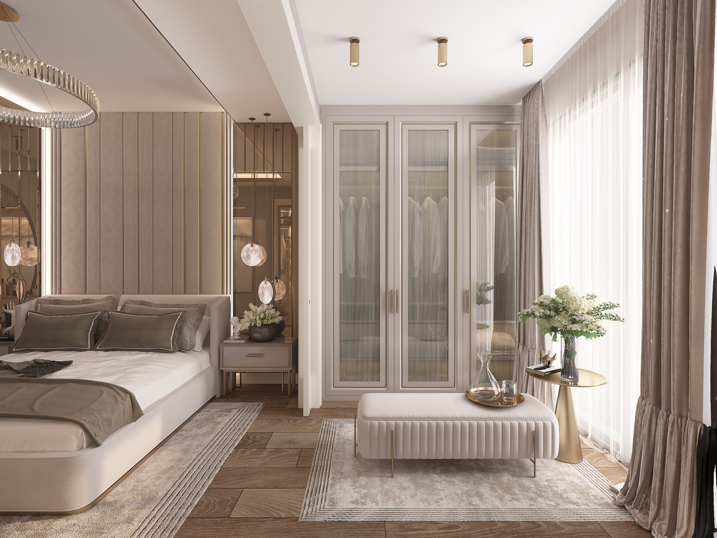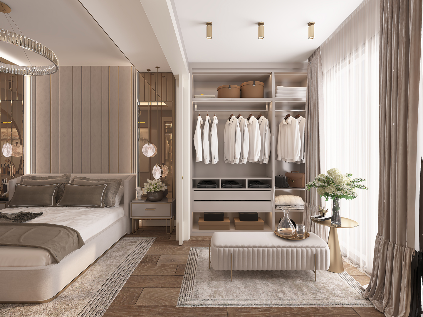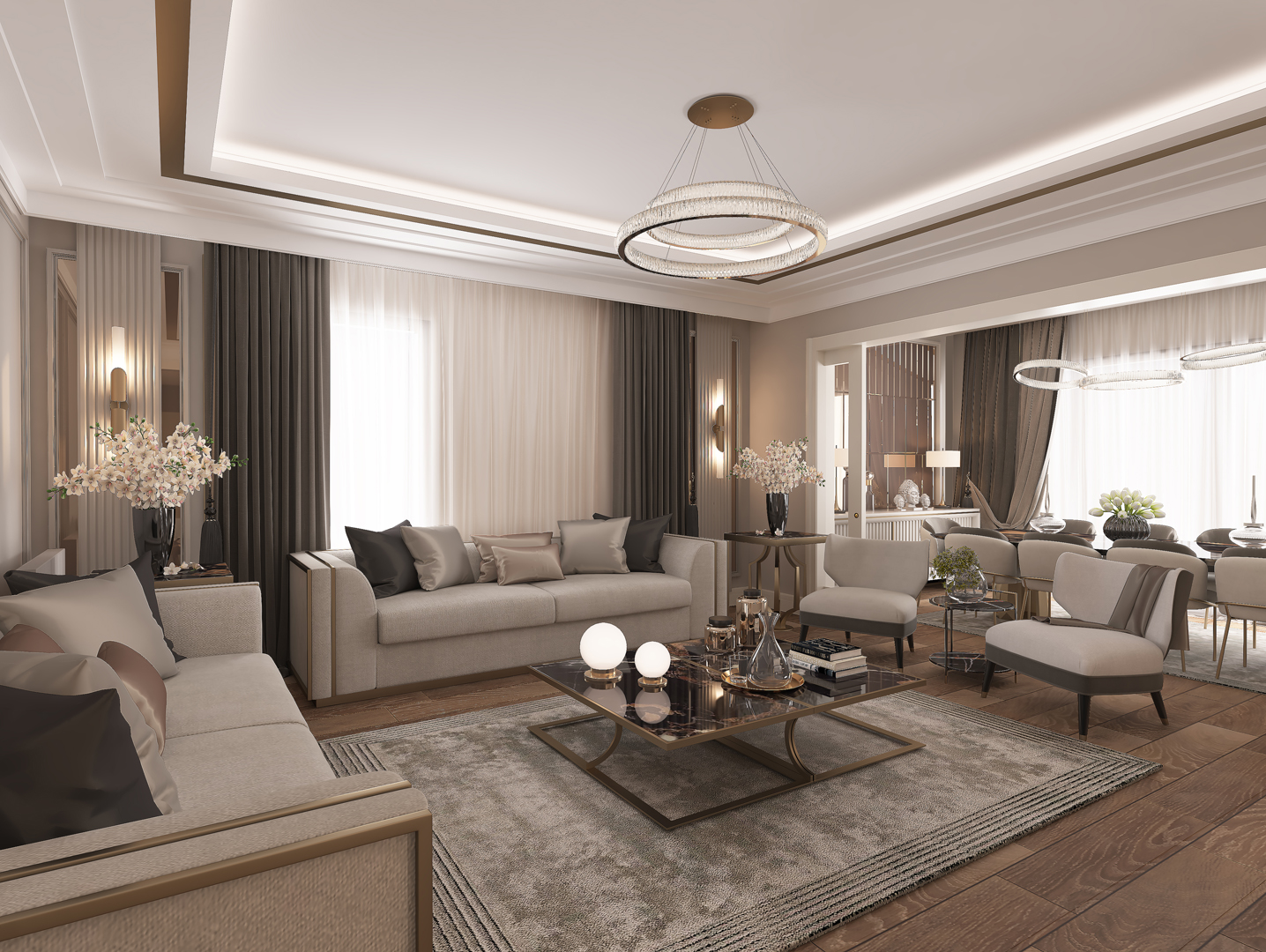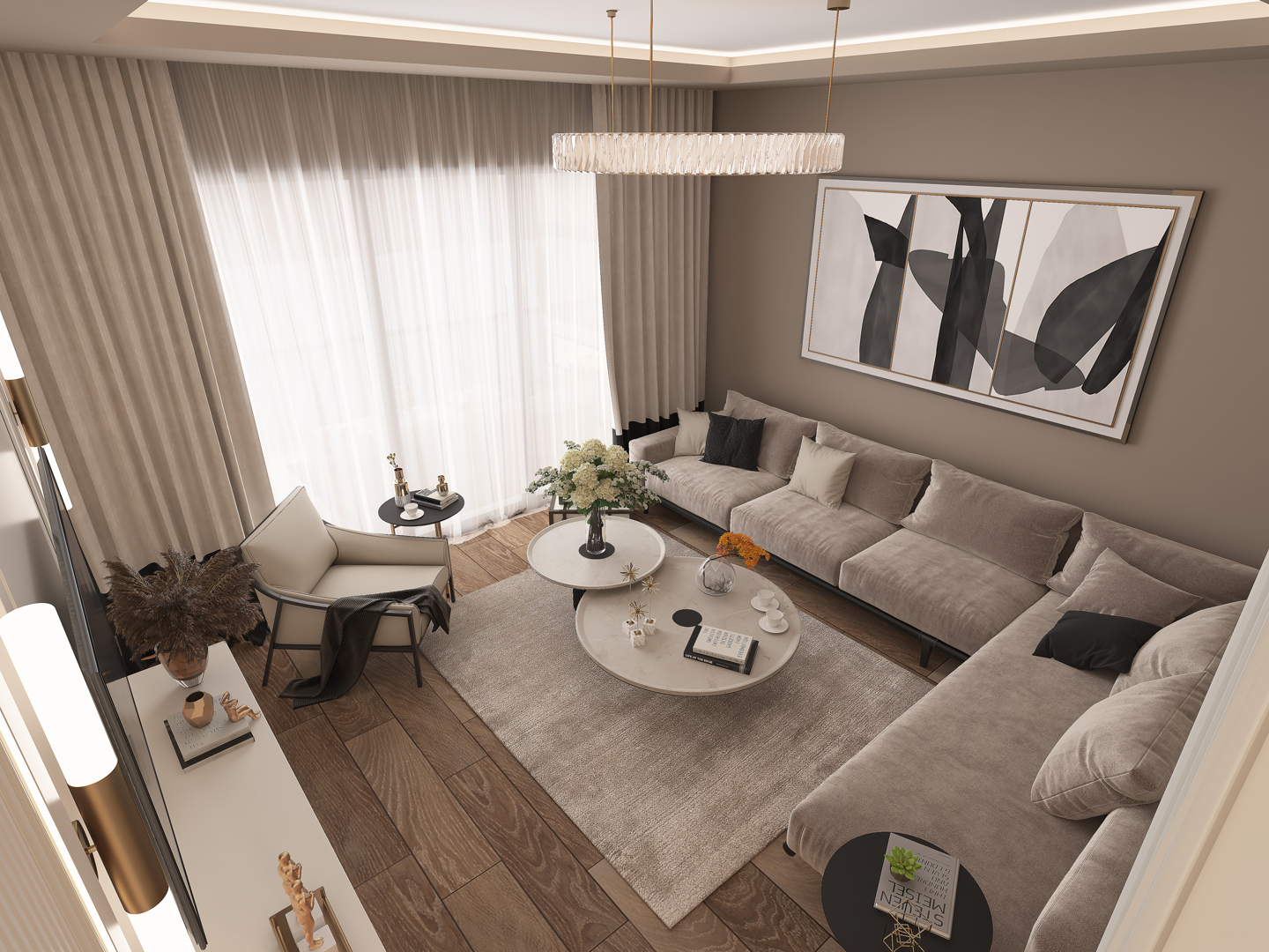 - Doğal ışığı vurgulayan geniş pencereler ve dikkat çekici perde tasarımları