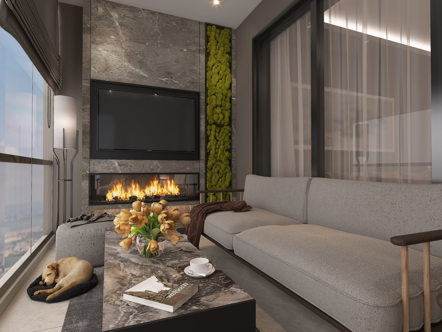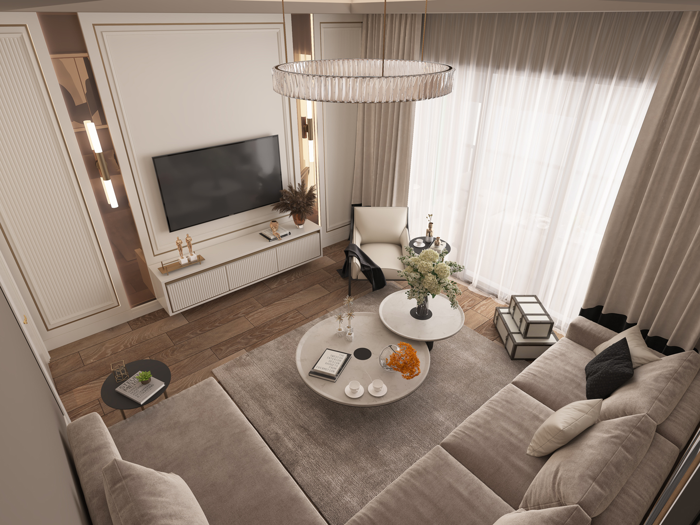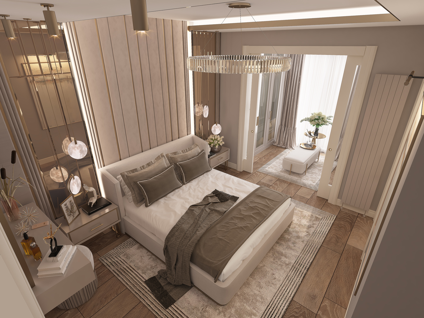 - Doğal ışığı vurgulayan geniş pencereler ve dikkat çekici perde tasarımları