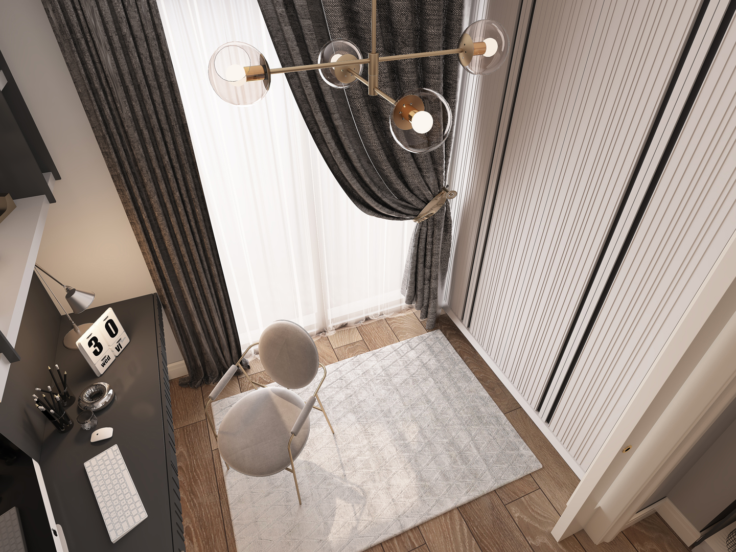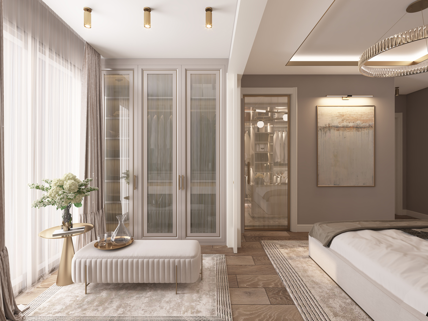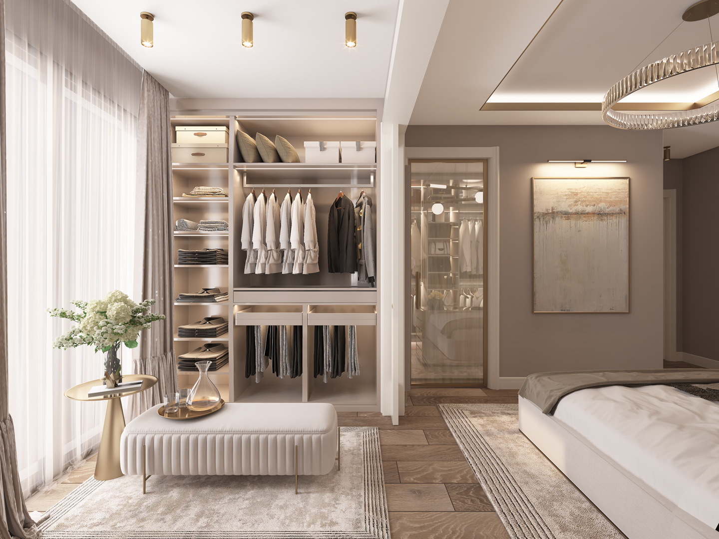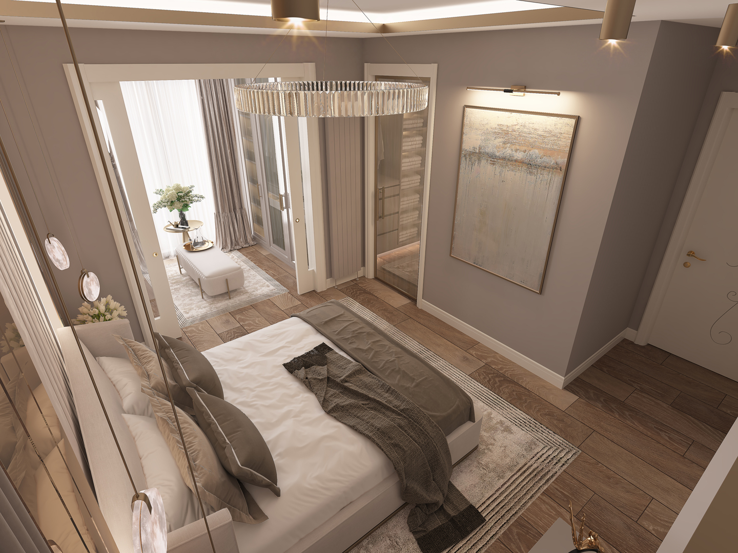 - Doğal ışığı vurgulayan geniş pencereler ve dikkat çekici perde tasarımları